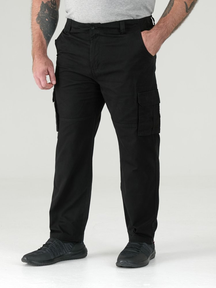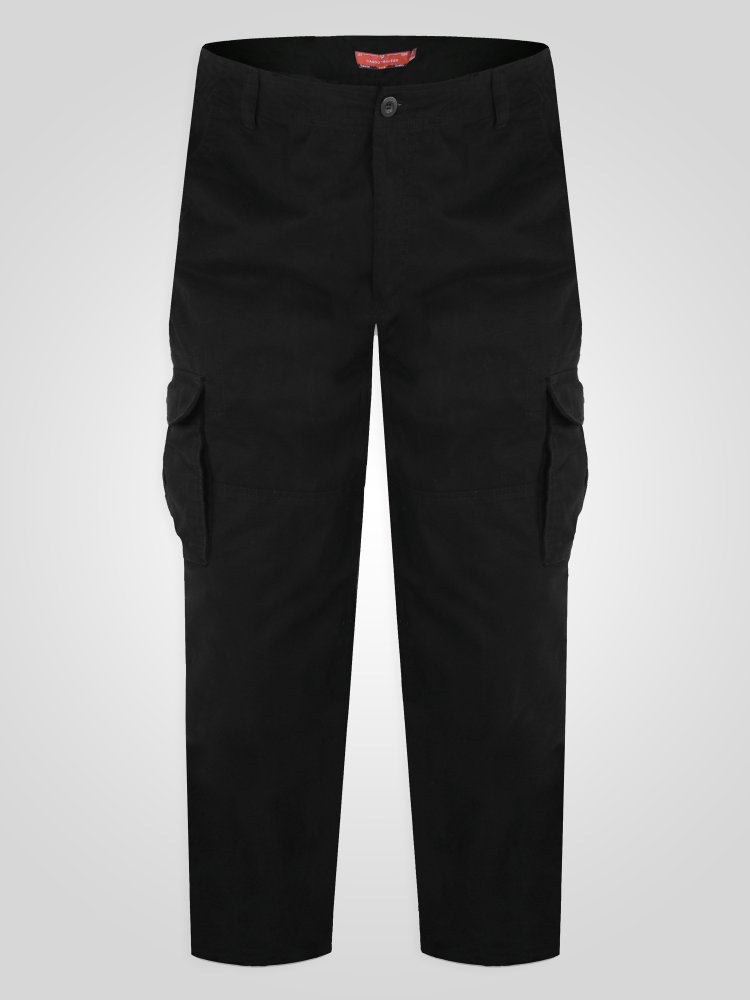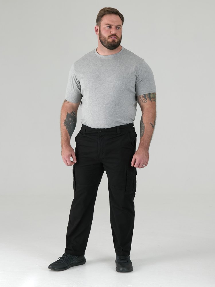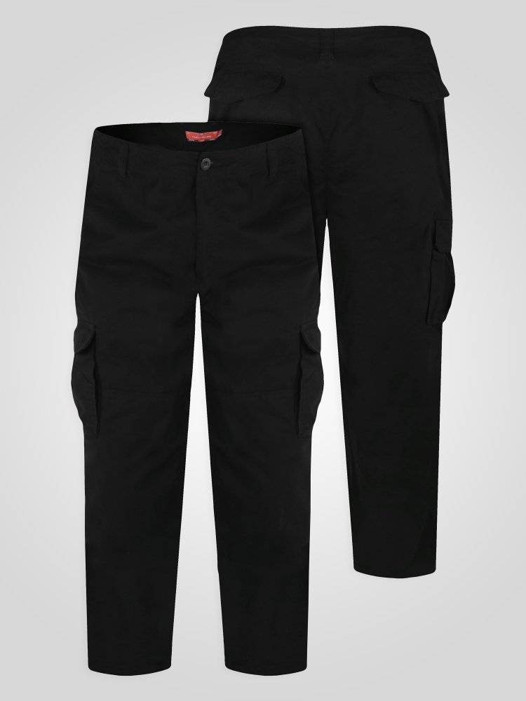 Kingsize Mens Cargo Pants from D555. Crafted from a pure cotton, the 'Robert' regular cut trousers are detailed with two side pockets, cargo pockets on both legs and two rear pockets. Fastened with a zip fly and top button closure, the cargo trousers are available in black.