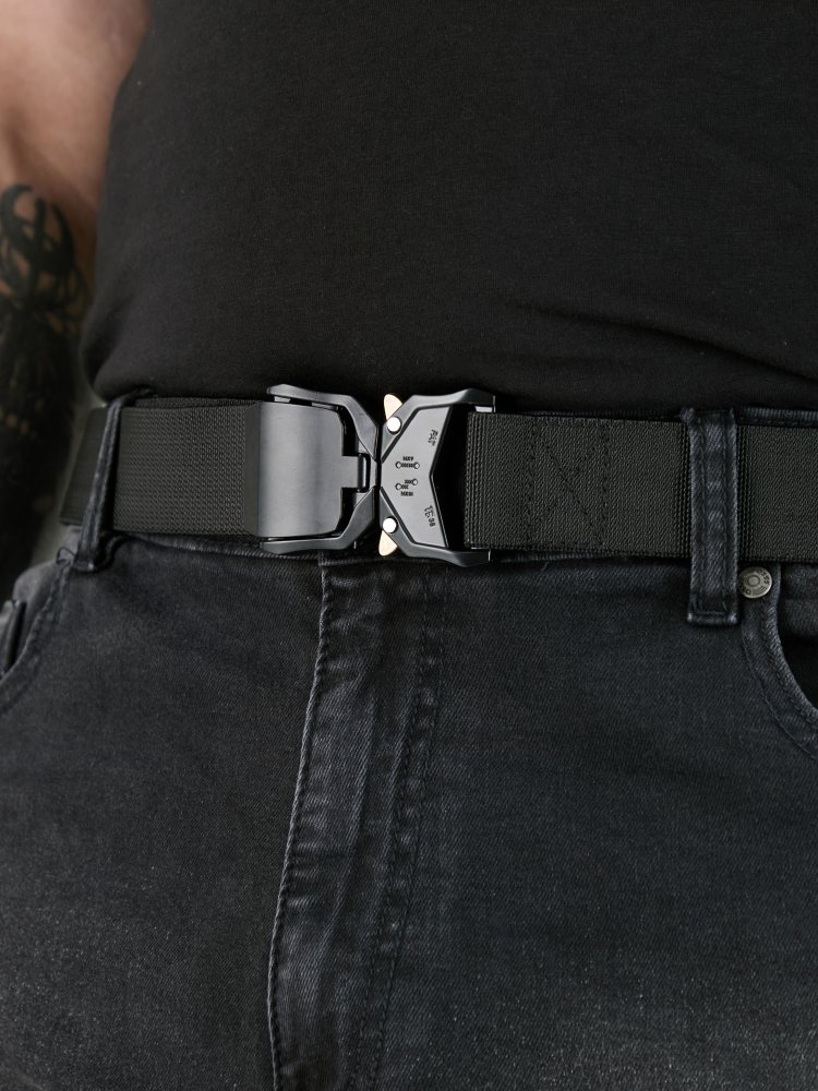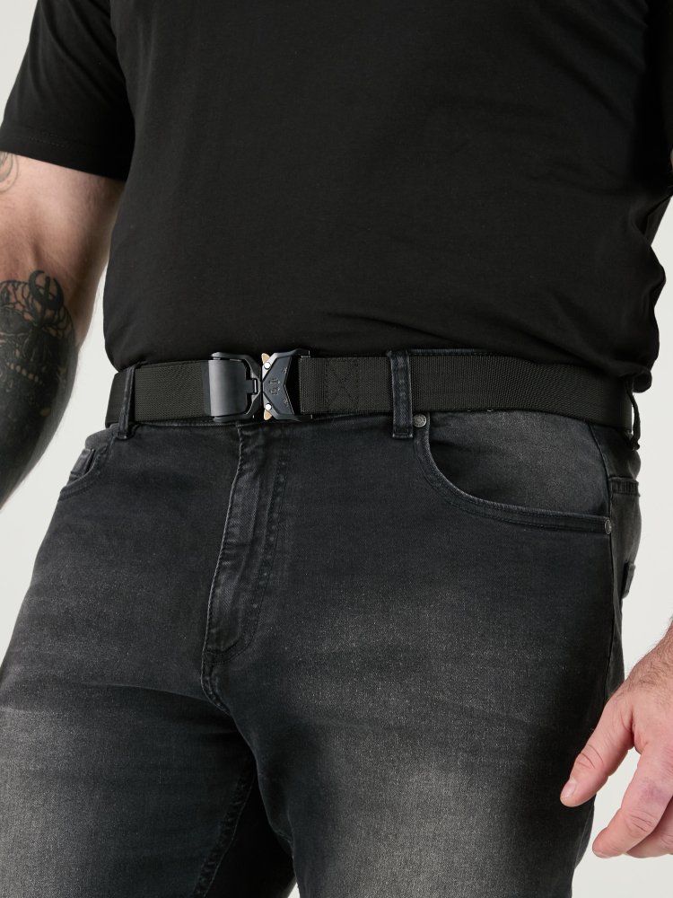 D555 Tactical Military Style Stretch Webbing Belt With Heavy Duty Quick Release Buckle. The belt is made of 100% polyester material, which makes it strong, durable, and resistant to wear and tear. The webbing is thick, making the belt ideal for everyday wear or for outdoor activities. Available in Black.