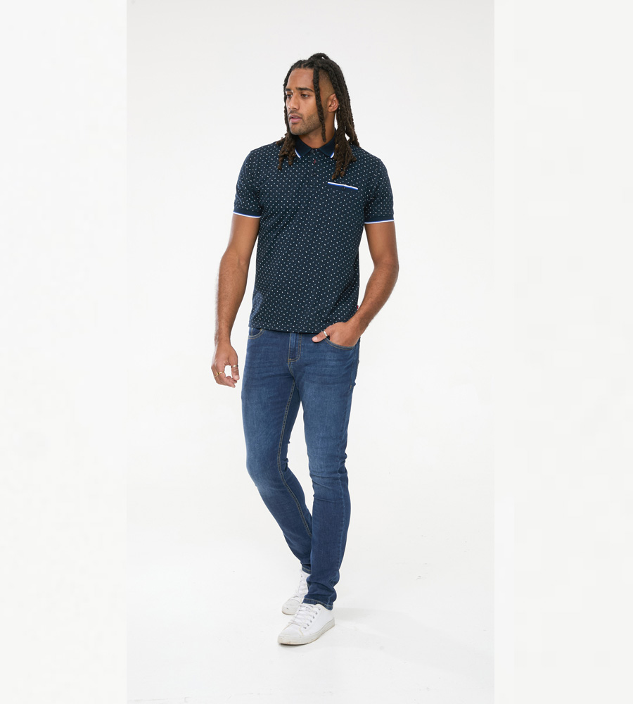Men's Polo shirt from D555. The 'Oakley' Jersey polo shirt features an all over print, a three button placket and short sleeves. Crafted from a quality pure cotton to ensure maximum comfort, the polo shirt has a chest pocket and jacquard trims on the collar, chest pocket and cuffs. Finished with subtle D555 branding and available in Navy.