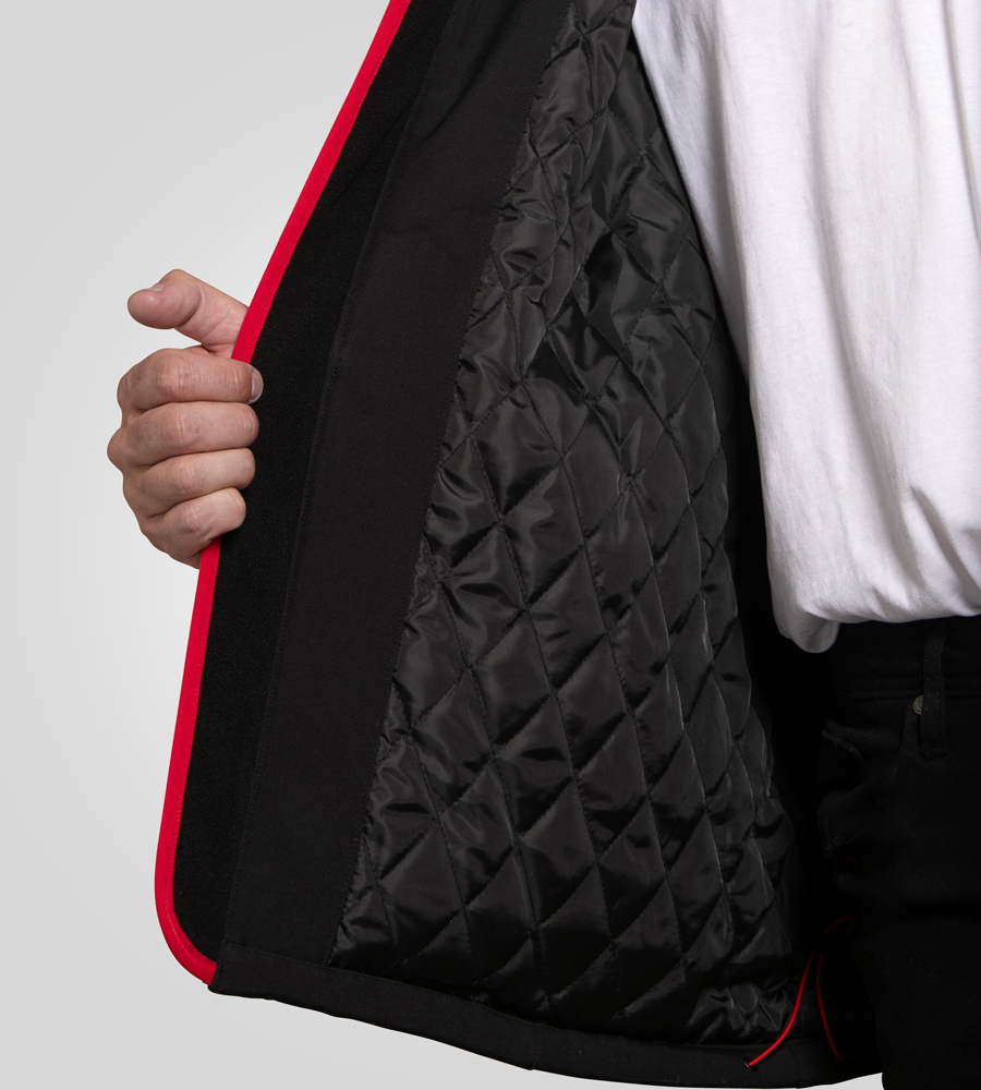 Built for both style and performance, the D555 'Fretwell' Jacket features a padded soft shell design with a detachable hood and bold red lining for a pop of contrast. Made from a durable poly-elastane blend, it offers flexibility and comfort. Finished with multiple zip pockets and contrast detailing, it’s perfect for everyday wear in changing weather. Available in Black.